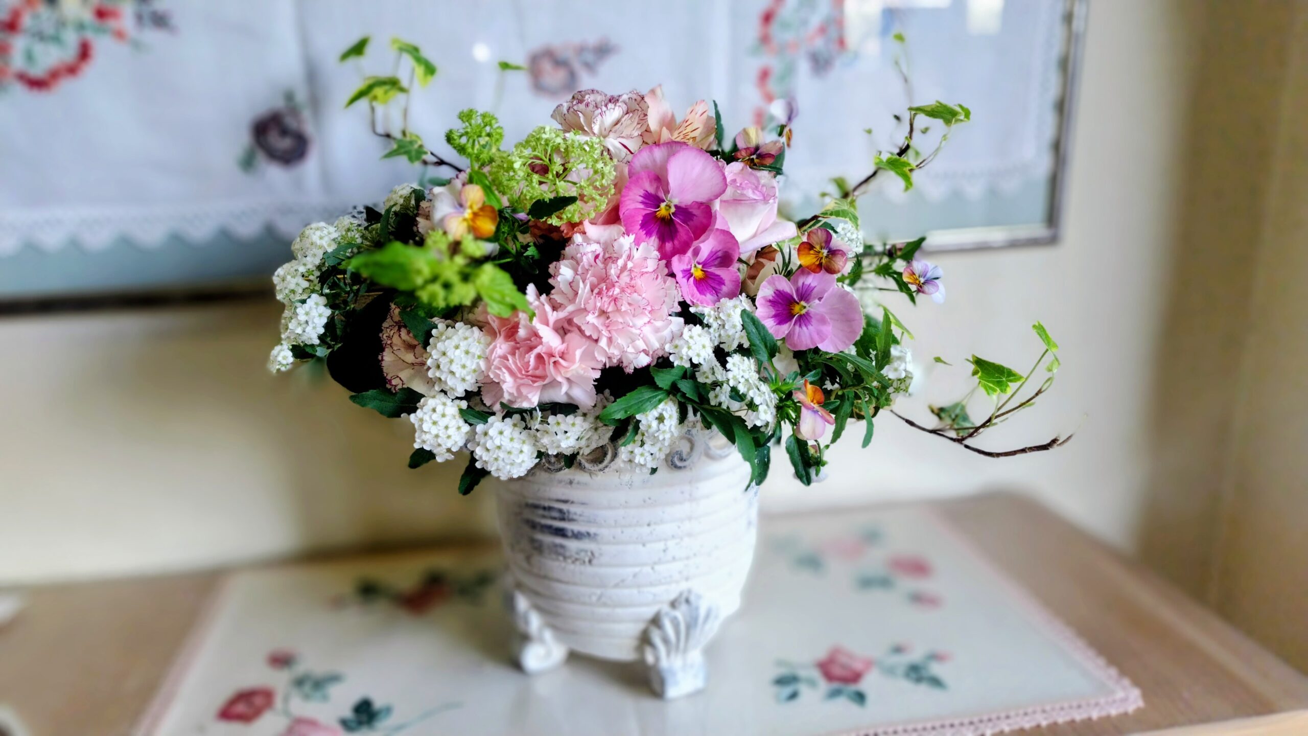 春のお庭の花を活ける