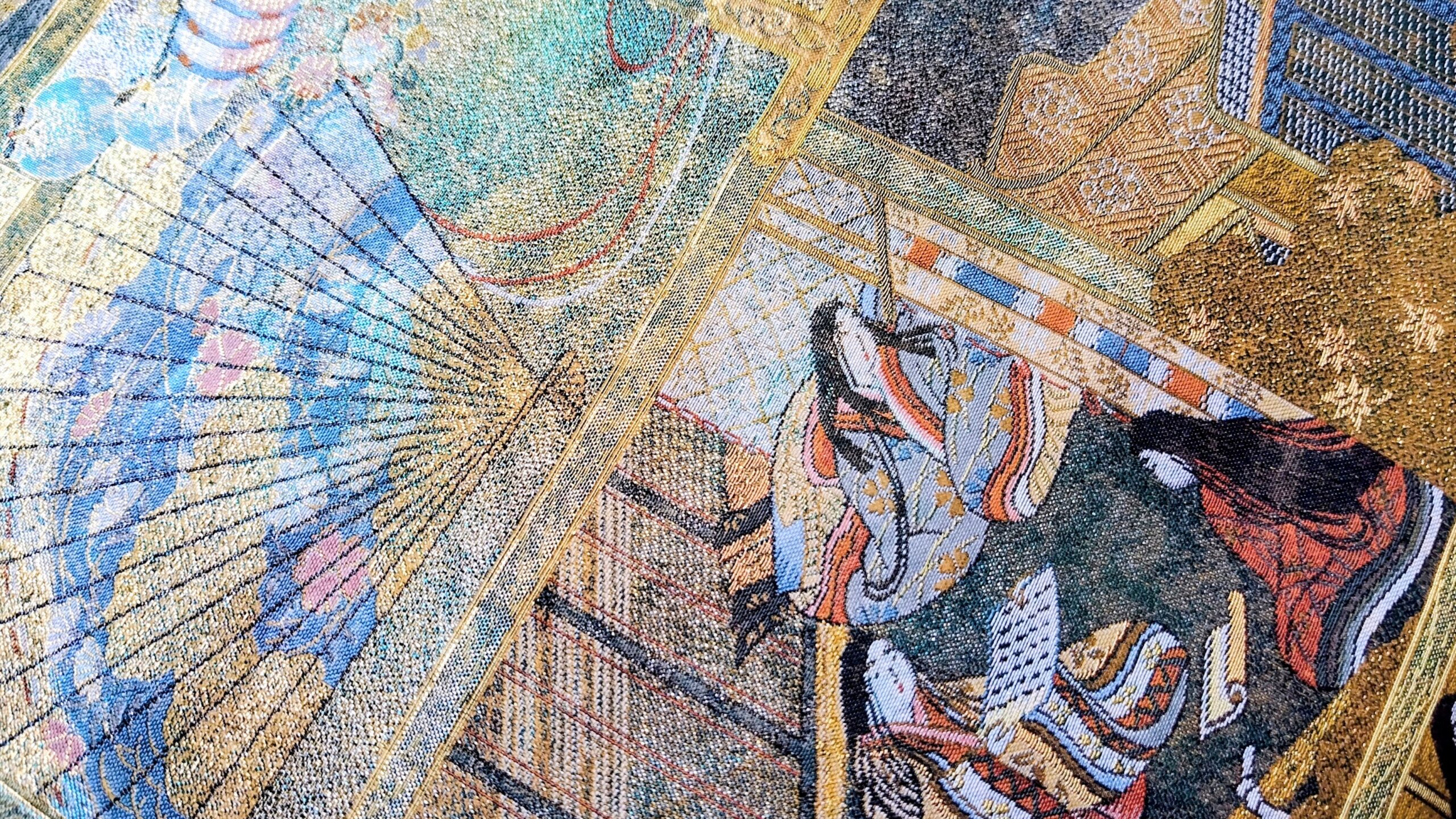 「源氏物語絵巻」の丸帯は高度な技術で絵画のような立体的な表現を可能にしています。