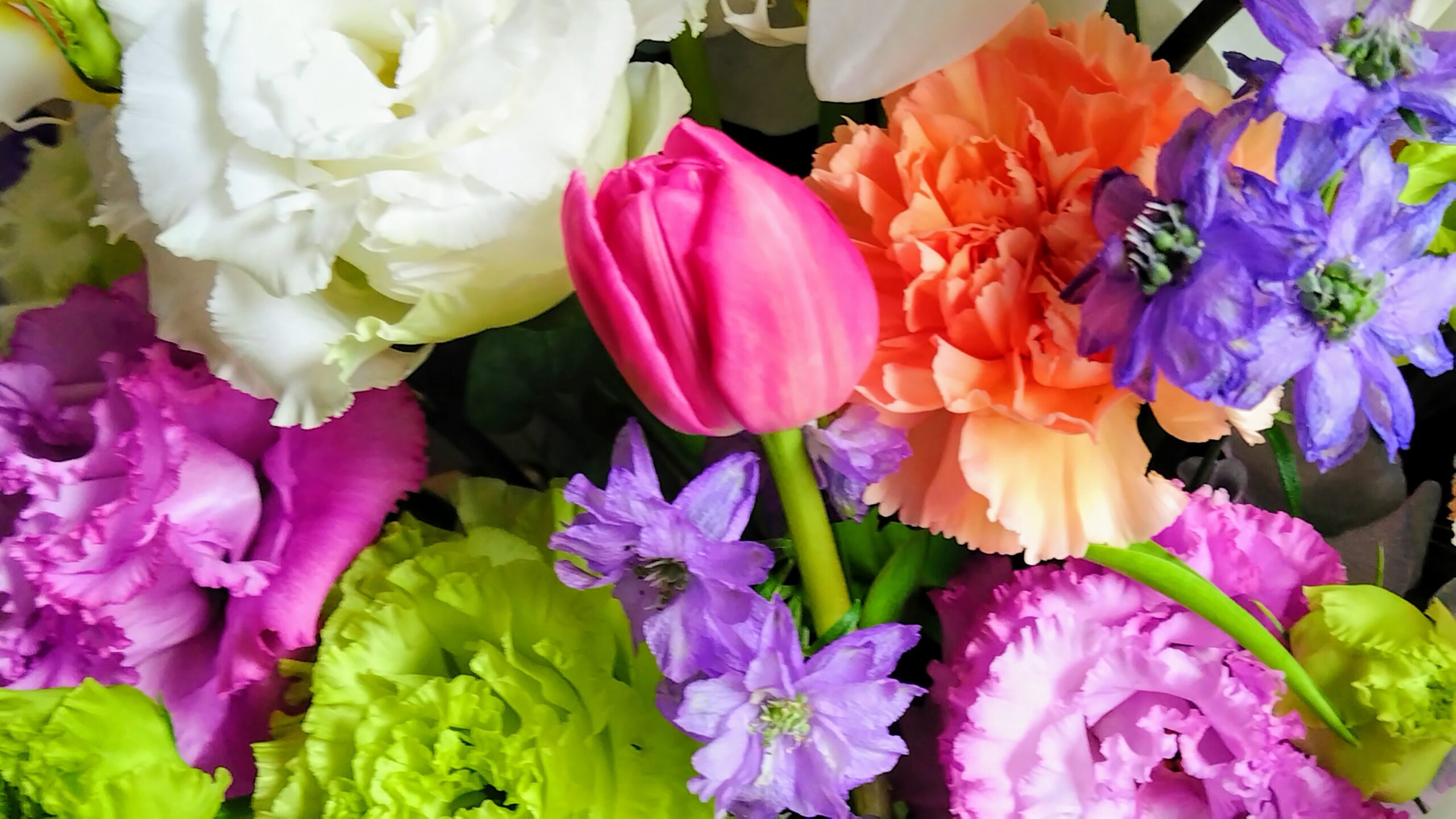胡蝶蘭アルストロメリアリシアンサス(紫色、白色、グリーン色)くすみピンクのカーネーション八重の可愛いチューリップ薄いブルーのデルフィニュームスイトピーはうすピンクグリーンはドラセナのみ
