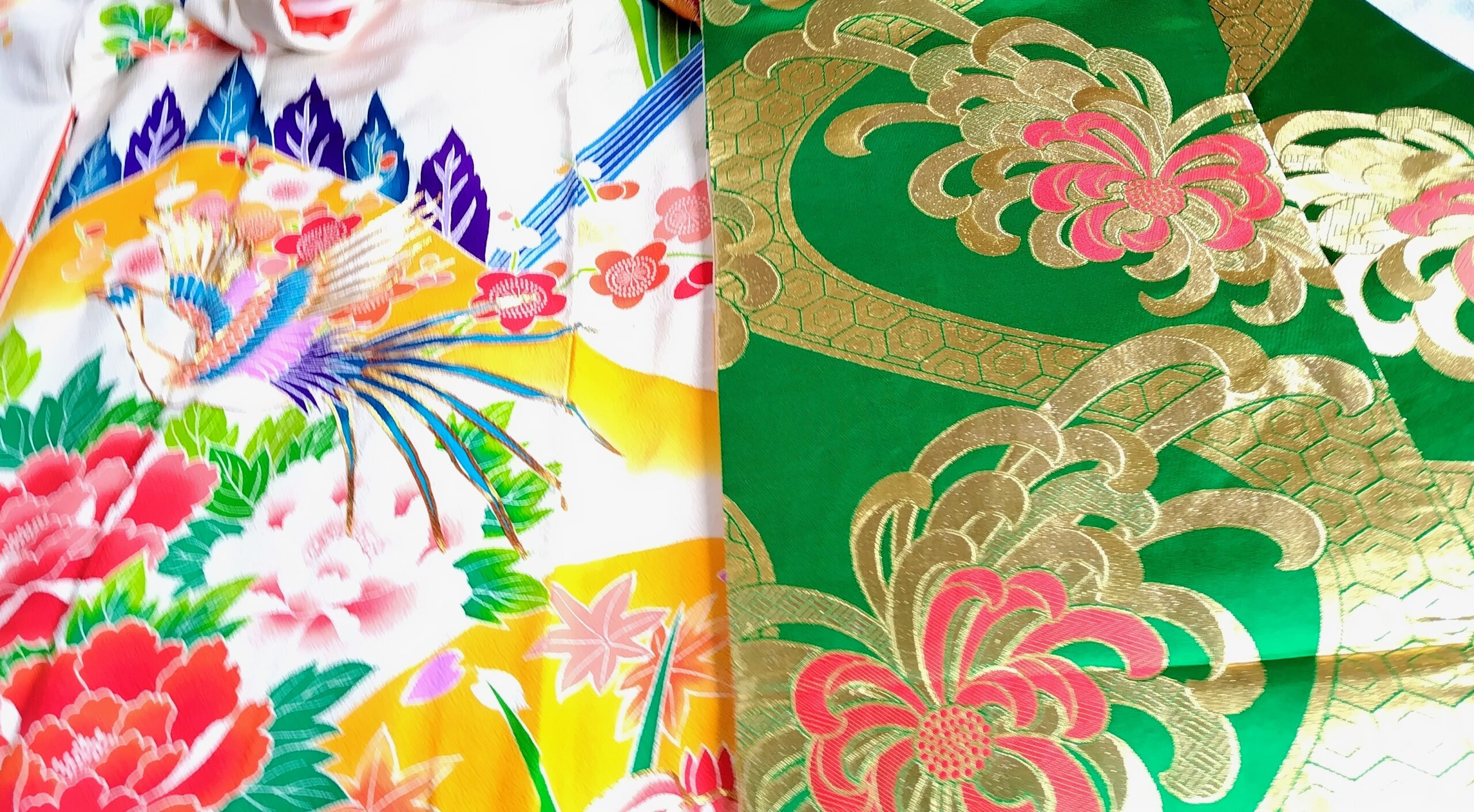 打ち掛けにある「赤、オレンジ、青」といった多色使いの柄と、帯の「緑、金、朱赤」は互いを引き立て相性が良いです。