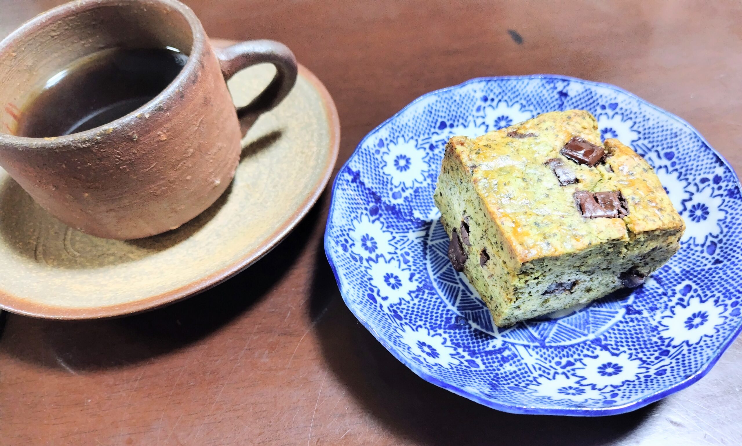 コーヒーカップは岡山の備前焼 お皿は伊万里の印判のなます皿